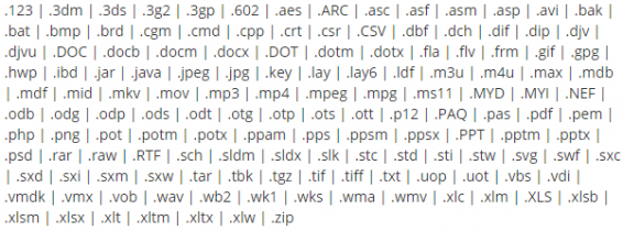 L'execution du ransomware projoque le chiffrement des fichiers ciblés, une extension «.bart.zip » est alors ajoutée au nom des fichiers chiffrés (il s’agit d’archives Zip chifrées). Voici la liste des types de fichiers chiffrés par Bart :