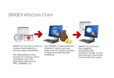 Le malware Dridex, qui se répand via des campagnes de spams sophistiquées, est inclus dans des pièces jointes ou fichiers de type Microsoft Office ou XML. Dans un blog, le chercheur en sécurité Brad Duncan a indiqué que la grande part de l'activité Dridex avait reprise, avec en parallèle un accroissement du nombre de fichiers Dridex inscrits dans le répertoire VirusTotal qui recense des échantillons de malware.