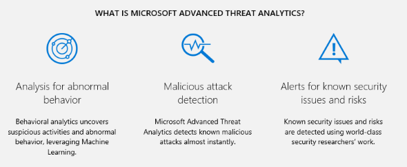 Advanced Threat Analytics (ATA), provient de l'acquisition de Aorato par Microsoft. Il utilise des outils d'apprentissage machine pour détecter un comportement inhabituel sur le réseau d'une entreprise et utilise cette information pour alerter les administrateurs.